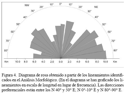 En total se contabilizaron 112 lineamientos que mostraron orientaciones preferenciales entre los N 0°10° E; N 30°40° E y N 80°90° E (Figura 4).
