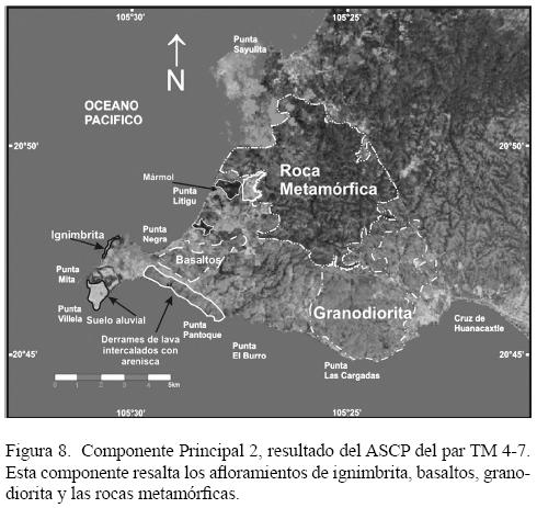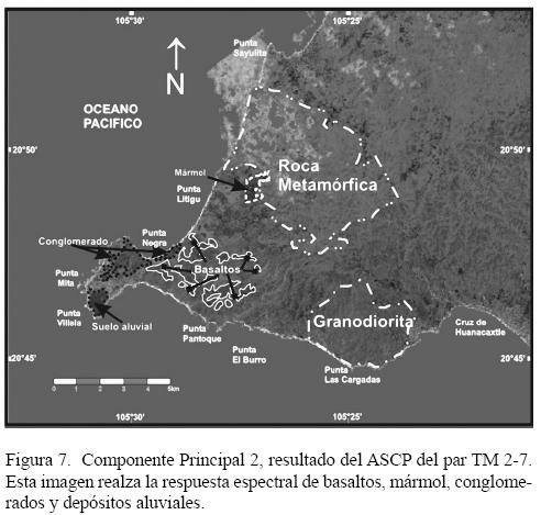 Se observa un mayor porcentaje de varianza en la Componente Principal 1 (CP1) del SPCA aplicado al par TM2TM7 (Figura 7) por el aporte de información de la banda TM7, mientras que la Componente Principal 2 (CP2) presenta el mayor aporte de la banda TM2. Esto da como resultado que en la segunda componente principal se aprecien zonas oscuras bien delimitadas que corresponden a basaltos con alteración representada por óxidos de hierro en la porción de Punta Negra, y una zona de píxeles aún más oscuros en la parte correspondiente al depósito aluvial en la parte central de Punta de Mita hasta Punta Villela. En Cerro Calera y Cerro Pátzcuaro se identifica también una agrupación de píxeles con brillantez muy baja, esta zona corresponde en campo a un afloramiento de mármol. Una pequeña parte dentro de lo identificado como depósito aluvial, aparece en píxeles aún más obscuros que en campo corresponde a conglomerados de arenisca, lutita y limonita.