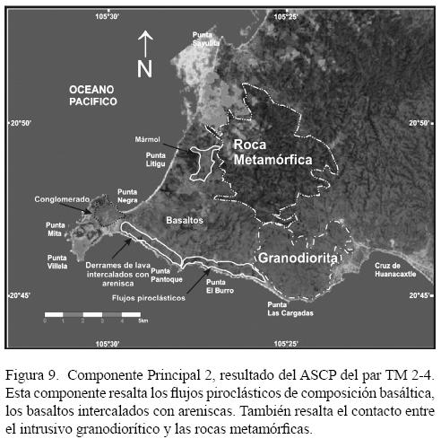 El par TM2TM4 (Figura 9) tiene un buen contraste espectral, lo que facilita la identificación de áreas de vegetación en tonos oscuros en la CP2. En la porción de Punta el Burro hasta Punta Pantoque, se observan conjuntos de píxeles obscuros que coinciden con flujos piroclásticos de composición basáltica. En la imagen se distingue un contraste entre estos píxeles y otros más claros, lo que indica un contacto que coincide con una secuencia de coladas o derrames constituidos por basaltos intercalados con areniscas, desde Punta Pantoque hasta el poblado Punta de Mita (ProlLedesma et al., 2003). Con este par es claramente visible una variación en el tono de los píxeles, lo que indica el contacto entre la roca metamórfica y el intrusivo de granodiorita.
