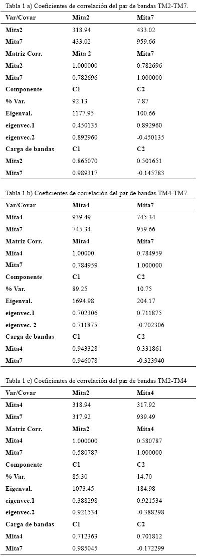 Para seleccionar los pares de bandas que se emplearon en el análisis espectral, se examinó la matriz de correlación para todas las bandas (Tabla 1). Se seleccionaron los pares menos correlacionados: TM2TM7 y TM4TM7 (0.783 y 0.785 respectivamente) y el par TM2 TM4, el cual presentó el menor coeficiente de correlación (0.581). Entre menor es la correlación el contenido de información al analizar el par de bandas es mayor puesto que la información redundante es menor. A estos tres pares se les aplicó el Análisis de Componentes Principales Estandarizado con lo que se obtuvieron dos componentes principales, siendo la segunda componente de cada par en la que se concentra la mayor cantidad de información espectral única en cada banda. Esta información se identifica visualmente como variaciones de brillantez de los píxeles de las componentes resultantes. Los datos obtenidos, a partir del SPCA aplicado a las imágenes de satélite, fueron comparados con la información recopilada en campo y reportada por ProlLedesma y colaboradores (2003).