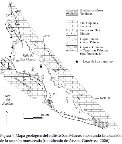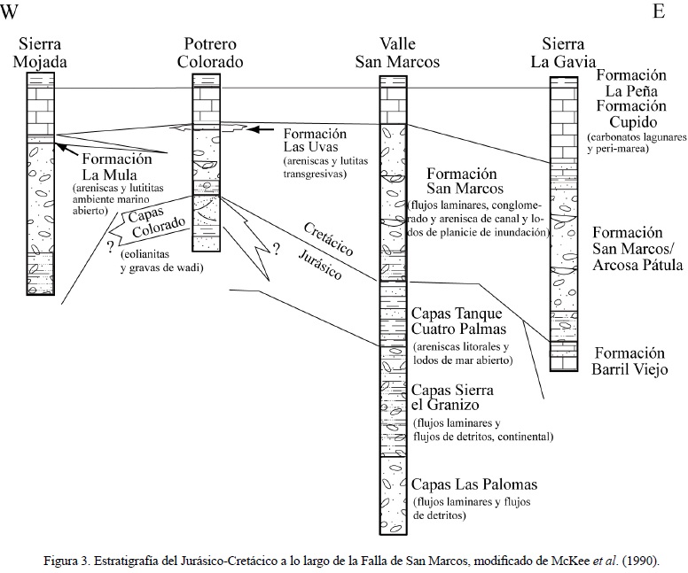 McKee et al. (1990) interpretaron la parte inferior de la sección clástica del valle de San Marcos, de edad Jurásica, como una secuencia depositada bajo condiciones marinas (en sus primeros 2000 m de espesor), pero observaciones de Equisetum sp. en posición de crecimiento, grietas de desecación y estratificación cruzada de tipo cuchara muestran depósito en ambientes continentales, al menos para parte de la sección. La secuencia Jurásica fue dividida en tres unidades litoestratigráficas informales (McKee et al., 1990): capas Las Palomas, capas Sierra El Granizo, y capas Tanque Cuatro Palmas (Figura 3). Esta última representa facies litorales y lutitas de mar abierto del Titoniano, y es la única con contenido fósil diagnóstico. Las capas Tanque Cuatro Palmas son correlacionables con la Formación La Casita del KimmeridgianoTitoniano en el norte y NE de México. Por su posición entre dos unidades clásticas conglomeráticas continentales, las capas Tanque Cuatro Palmas representan una etapa de inactividad de la FSM (McKee et al., 1990).