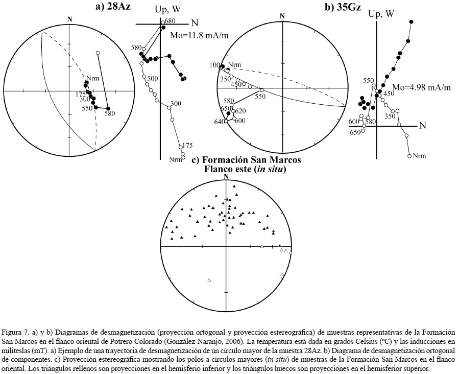 La magnetización remanente natural de las rocas de la Formación San Marcos en el valle San Marcos es de una intensidad moderada (del orden de varios mA/m) y normalmente consiste de dos componentes vectoriales (Figura 6). La componente de baja temperatura de bloqueo (menor a 450 °C) tiene una dirección hacia el NNW o NNE y una inclinación moderadamente positiva; en cambio, la de alta temperatura se dirige hacia el NW con inclinación similar a la anterior o ligeramente más alta (Figura 6a). La dirección in situ promedio de la componente de baja temperatura es de D = 8.5 °, I = 51.7 ° (n = 33 muestras). Inducciones de 120 mT no remueven una fracción significante de la MRN (Figura 6b). Pocas muestras fueron desmagnetizadas por campos alternos, pues en general este método no separa las magnetizaciones presentes en las muestras. En cambio la componente característica se define en un rango aproximado de 625665 °C, lo que indica que la magnetización reside principalmente en hematita. La temperatura máxima de bloqueo es mayor a 665 °C. En algunas muestras se calcularon trayectorias de círculos mayores para determinar la dirección de magnetización característica (Figura 6c). Estas muestras corresponden a direcciones de polaridad inversa, dirigidas al SE y con inclinaciones negativas (Figura 6e). Un gran número de muestras están afectadas por descargas eléctricas (rayos), las cuales se identifican como magnetizaciones de baja estabilidad (baja coercitividad) y direcciones erráticas. Estas magnetizaciones secundarias son fácilmente eliminadas durante el proceso de desmagnetización.