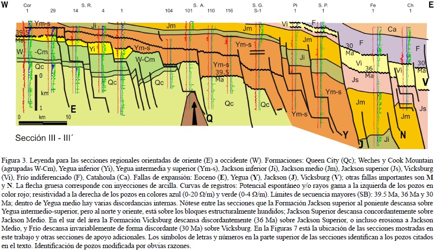 La correlación de las secciones regionales transversales a la cuenca (Figuras 3, 4 y 5) muestra un marco geológico ilustrativo en ellas. Al poniente, las secciones muestran que el límite inferior de Yegua corresponde a una litología de arenisca granocreciente, limitada en su cima por una discordancia que puede seguirse regionalmente. La base de este cuerpo arenoso inicia sobre la arcilla de la Formación Cook Mountain; el conjunto de ambas litologías corresponde a una secuencia granocreciente, progradante, de nivel alto (Highstand Systems Tract, HST), que cierra el ciclo genético, con su límite de secuencia en la parte superior, dado por una discordancia regional. Con apoyo de foraminíferos, en el presente trabajo se asume que esta discordancia puede corresponder aproximadamente a 39.5 Ma. Asimismo, se considera que este cuerpo de arenisca granocreciente es estratigráficamente equivalente a la Formación Crockett y se propone que sea denominada unidad Yegua inferior.
