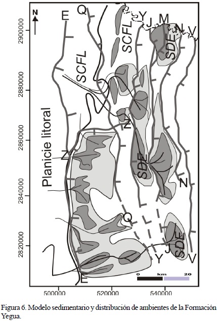 Con base en el análisis de secuencias y con apoyo de núcleos de pozos, afloramientos y espesores, se propone un modelo sedimentario para la Formación Yegua. El modelo se aproxima a definir ambientes de planicie costera, litorales, de abanico de delta y de estuario, de facies someras al occidente y profundas al oriente.