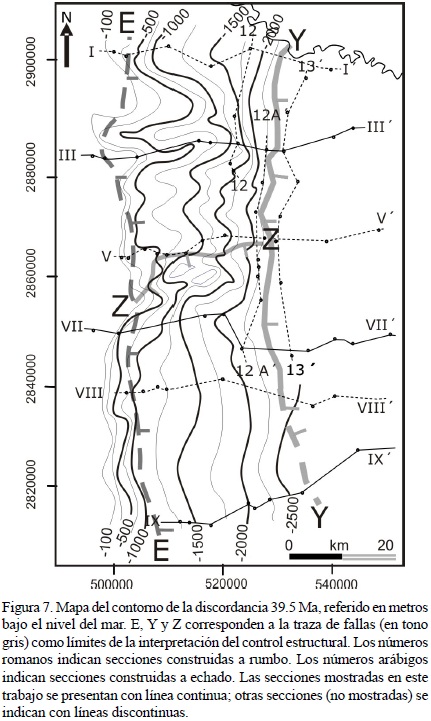 La discordancia de 39.5 Ma, hacia el oriente de las secciones, echado abajo en la cuenca, corta a capas más antiguas y, de occidente a oriente, llega a eliminar gradualmente a sedimentos de Yegua inferior, Cook Mountain, Weches e incluso a la cima de Queen City. La discordancia 39.5 Ma es una marca regional y un límite de secuencia muy constante en toda el área (Figura 7), pero sólo en la porción central y occidente de ésta, es posible controlar su paso, ya que hacia el oriente, por las fallas de mayor crecimiento (Y, J y V), no puede controlarse esta discordancia a profundidad.