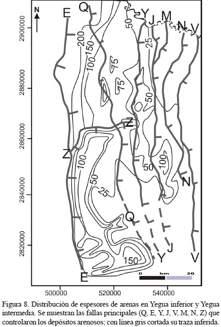 Yegua intermedia es un depósito de espesor delgado al poniente (250 m), pero se engrosa al oriente en las proximidades de la falla de expansión Q, y en la falla Y llega a alcanzar más de 700 m (Figura 8). Esta cuña está compuesta principalmente por material arcilloso con cuerpos de areniscas erráticas de difícil correlación distribuidas en su base como abanicos de piso y derrumbes; tiene sobrelapamiento (onlap) sobre la discordancia de 39.5 Ma (Figura 9). La parte media y la cima de esta sucesión de estratos de Yegua intermedia presentan numerosos canales o valles de incisión (Figuras 3 y 4) con varias discordancias internas observadas con sísmica, algunas de las cuales tienen continuidad por decenas de kilómetros, pero son difíciles de seguir de una sección a otra.