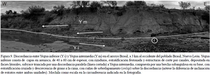 La discordancia sobre Yegua inferior es un límite de secuencia (Sequence Boundary, SB) prominente, por posición estratigráfica entre las unidades Yegua inferior y Yegua intermedia, que la limitan (Figuras 2 y 9). La discordancia se correlaciona con el límite de secuencia de 39.5 Ma propuesto por Haq et al. (1988), considerado como un límite de segundo orden. Esta discordancia al occidente erosionó las cimas de la unidad Yegua inferior y la Formación Cook Mountain, al oriente erosionó unidades tan antiguas como las Formaciones Reklaw y Queen City, mientras que al sur y suroeste erosionó unidades más antiguas que las citadas.