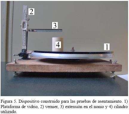 Las pruebas de asentamiento se realizaron empleando un dispositivo construido tal como se muestra en la Figura 5. El dispositivo consiste de una base y un cilindro. La base tiene una plataforma de vidrio nivelada y un vernier fijo, al vernier se le ajustó una extensión en el nonio para medir la altura del asentamiento. El cilindro que se utilizó es de PVC de altura H = 0.047 m, diámetro D = 0.037 m y con una razón H/D = 1.28, que es una de las recomendadas por Pashias et al. (1996) para estas pruebas.