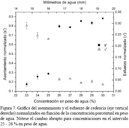 En el eje horizontal superior de las Figuras 7 y 8, se incluye una relación de la concentración de agua y la cantidad de milímetros de agua de lluvia. Esta se calculó a partir de dividir el volumen de agua que corresponde al volumen de muestra (para una concentración fija) contenida en el cilindro entre el área del cilindro, suponiendo que dicha cantidad de agua fue colectada en el cilindro debido a las precipitaciones pluviales. Aunque esta suposición es burda, se tiene una idea aproximada de los milímetros mínimos necesarios para la ocurrencia de un flujo de detritos hiperconcentrado. Hasta donde se sabe, no se tienen datos en la literatura de la absorción de agua pluvial en la zona susceptible a este tipo de eventos que permitan mejorar esta aproximación. Para hacerlo, se debe tomar en cuenta que sólo parte del agua pluvial es absorbida por el suelo, mientras que la restante se transporta por vertientes hacia ríos o coladeras. En este caso, la región crítica en donde el esfuerzo decrece abruptamente se localiza entre 16 y 17 mm de agua. Es de hacer notar que estos valores están por debajo de la precipitación pluvial extraordinaria (27.4 mm) ocurrida el 6 de septiembre de 2009 en esta zona. No obstante, en el evento mencionado no se tiene la certeza de que el nivel de humedad crítico en la tierra se hubiera alcanzado.