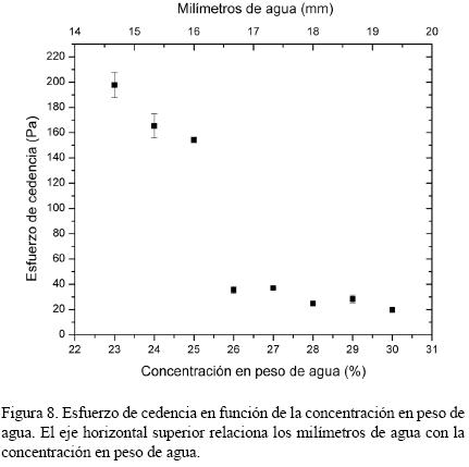 En la Figura 8 se muestra el esfuerzo de cedencia calculado a partir de la Ecuación 4, en función de la concentración porcentual de agua con sus correspondientes barras de error. Se puede observar que para concentraciones de agua en el intervalo 2325 %, el esfuerzo de cedencia disminuye gradualmente en el intervalo de 200 Pa a 150 Pa, como es de esperarse debido a la poca concentración de agua. Por otro lado, en el intervalo crítico de 2526 % se presenta el cambio más abrupto en el esfuerzo de cedencia que va de un valor de 153 Pa a 35.5 Pa. Si recordamos que la presión de poro representa a la presión de agua que llena los espacios vacíos, el suelo se vuelve inestable debido a que las partículas pierden cohesión entre sí, lo que resulta en la disminución dramática en el esfuerzo de cedencia. Para concentraciones de agua mayores que el 26 %, la tendencia general es a disminuir entre los valores de 38.3 Pa y 19 Pa.