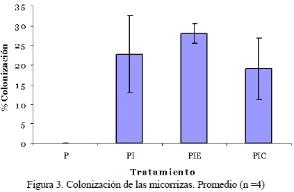 En relación a la colonización de las micorrizas, se observa en la Figura 3 que el menor porcentaje lo presentó el tratamiento de planta + inóculo + composta (PIC) con 19 % y el mayor el menor el tratamiento planta + inóculo + estiércol (PIE) con 26.75 %. Esto puede deberse al mayor contenido de materia orgánica aportada por el estiércol, equivalente a 72 Mg ha1, contra 40 Mg ha1 de la composta. Se ha observado que la colonización micorrízica total aumenta de manera notoria por efecto de la aplicación de materia orgánica (Ferrera et al., 1997).