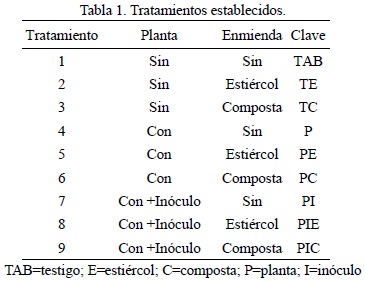 Con base en lo anterior se establecieron los tratamientos siguientes (Tabla 1): el tratamiento testigo absoluto (TAB) consistió solamente en el tepetate fragmentado en su maceta al cual solo se le agregó agua, al mismo tiempo que a los otros tratamientos. El testigo absoluto cero (TABo) fue el tepetate tal como se trajo del campo. El testigo con estiércol (TE) fue igual que TAB pero se la agregó estiércol. El testigo con composta (TC) fue igual que TAB, pero con adición de composta. El tratamiento planta (P) consistió en la planta de durazno con el tepetate fragmentado. Planta estiércol (PE) fue tepetate fragmentado, durazno y estiércol. Planta composta (PC) fue tepetate fragmentado, durazno y composta. Planta inóculo (PI) fue tepetate fragmentado, durazno más inóculo. Planta inóculo estiércol (PIE) tepetate fragmentado, durazno, inóculo y estiércol. Planta inóculo composta (PIC) tepetate fragmentado, durazno, inóculo y composta.