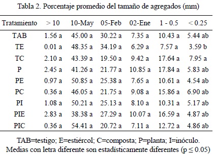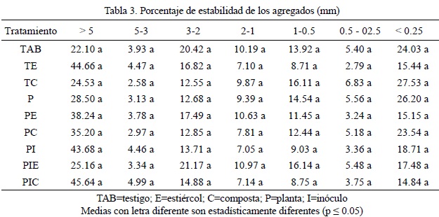 La fracción > 5 mm presentó el mayor porcentaje de estabilidad de agregados y el menor porcentaje de agregados de 3 a 5 mm (Tabla 3). García et al. (2009), también reportaron el mayor dominio de agregados en húmedo en la fracción > 5 mm.