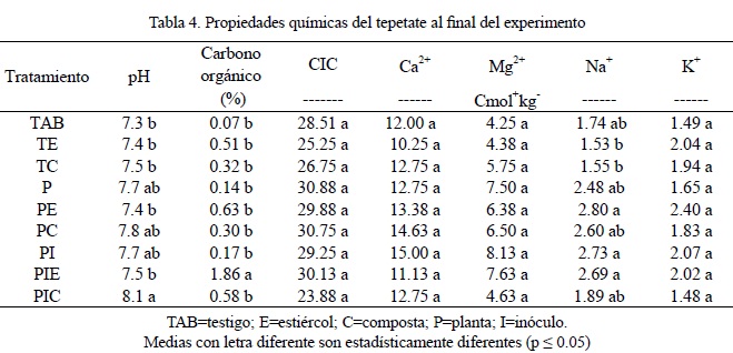 Los análisis químicos mostraron que el valor de pH varió de 7.3 a 8.1. El valor más bajo fue el del testigo absoluto (TAB) y el más alto el del tratamiento de planta + inóculo + composta (PIC). Con relación al testigo absoluto hubo un incremento en el potencial de hidrógeno. Se presentaron diferencias significativas (P ≤ 0.05) sólo entre PIC y la mayor parte de los tratamientos (Tabla 4). Esto pudo deberse a la aplicación de la composta, la cual tenía pH de 7.7 y era rica en bases, así como a la actividad de la planta, que favorece el intemperismo del tepetate con la consecuente liberación de las bases al medio.