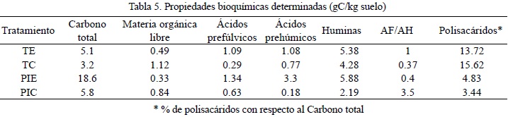 En la Tabla 5 se presentan únicamente las diferentes propiedades bioquímicas de los tratamientos que alcanzaron los niveles más altos. Asimismo, dichos contenidos están en relación al contenido total de carbono orgánico de cada tratamiento. Para estos análisis se seleccionó la repetición con mayor porcentaje de carbono de cada tratamiento y se realizó por duplicado, por lo que no se aplicó el análisis estadístico de estos parámetros y únicamente se hace un análisis descriptivo.