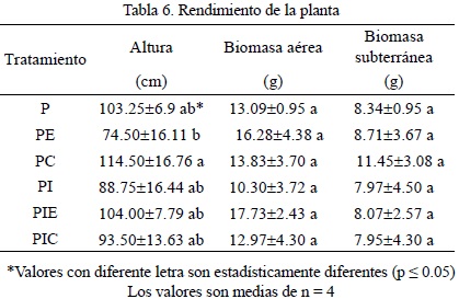 En el rendimiento de la planta solamente en la altura se manifestaron diferencias significativas (p ≤ 0.05). Así, el tratamiento planta + composta (PC) obtuvo la altura mayor y el de planta + estiércol (PE), la menor. Tanto en biomasa aérea como subterránea no hubo efecto de los tratamientos (Tabla 6).