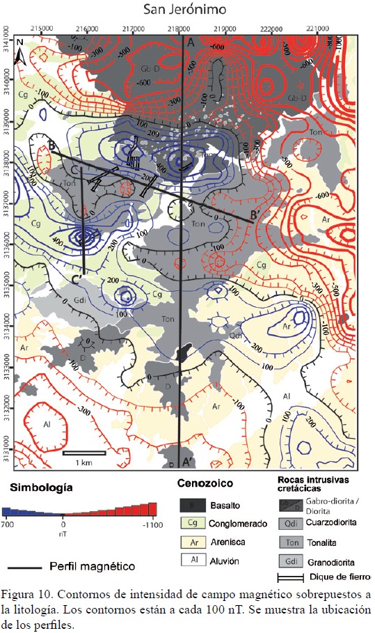 El mapa aeromagnético residual resultante se sobrepuso al geológico (Figura 10) y se realizó una interpretación cualitativa basada en el examen de la forma y la intensidad de las anomalías. Se observa en el mapa geológicomagnético que los principales dipolos están en la unidad gabrodiorítica del norte. Sobre esa unidad, el dipolo principal tiene una amplitud de 1300 nT y la parte positiva del dipolo coincide con el afloramiento de un dique de óxidos de fierro. Otro dipolo notable en la región centrooriental del mapa, sobre el cuerpo de areniscas, tiene una amplitud de 1200 nT. Hay otros dipolos pequeños, de los cuales, el más notable está en el extremo norte del mapa, 219000 m coordenada este. Hacia el sur del plutón San Jerónimo es notable la disminución en los valores de la intensidad magnética y que el polo negativo mayor está sobre aluvión que aparentemente cubre a un cuerpo diorítico. Además, se observa que los ejes de los dipolos de las anomalías magnéticas dipolares identificadas en la zona se orientan casi N S con su polo negativo al norte, coincidiendo con la orientación del campo magnético terrestre actual, lo que sugiere que la magnetización que prevalece en los cuerpos es de tipo inducida y que al magnetizarse adoptan esa dirección.