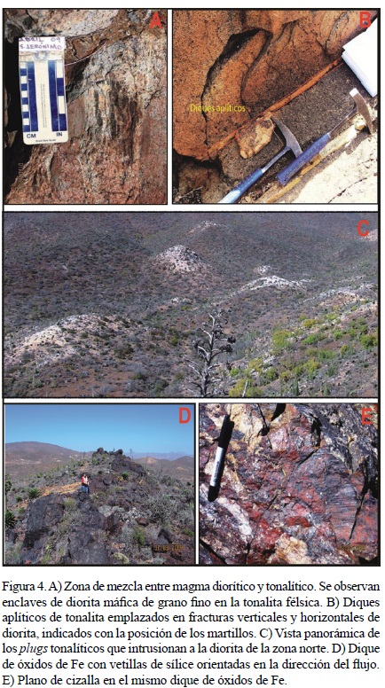 En muchos de los respaldos de los diques de óxidos de Fe, es común que diques tonalíticos (plugs) presenten texturas aplíticas que indican gradientes de temperatura grandes que pueden deberse a la rápida pérdida de calor del magma en ascenso (tonalita) al ponerse en contacto con superficies preexistentes más frías y sólidas, en este caso de los cuerpos de Fe. Estas aplitas tonalíticas, están asociadas a su vez con cuerpos más grandes de la misma composición que forman series de diques pequeños de aspecto circular (plugs) alineados NE SW y que intrusionan a la unidad gabrodiorítica. Se identificaron zonas de mezcla de tonalita penetrando en diorita en la zona con mayor densidad de plugs, por lo que se interpreta que el magma félsico se emplazó a lo largo de fracturas de extensión, principalmente verticales, desarrolladas por enfriamiento en la zona de frontera de la masa gabrodiorítica. Lo anterior implicaría que dichos plugs, de aspecto circular, estuvieran unidos a profundidad y formaran un dique de cerca de 1 km de anchura según la exposición superficial de los plugs y el arreglo paralelo que guardan con la orientación de las fracturas verticales. Estructuras activas similares han sido reportadas en distintos lugares (por ejemplo en el volcán Miyakejima, Japón; Furuya et al., 2003).