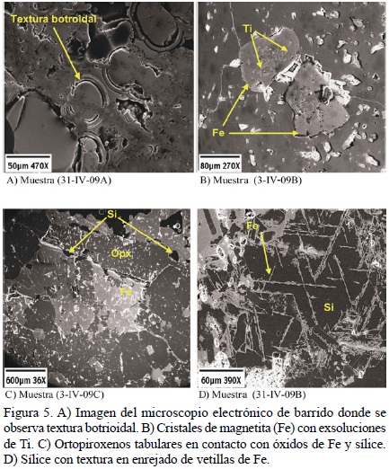 Durante el análisis petrográfico y de microscopía electrónica de barrido de las muestras de los diques 3IV09A, 3IV09B, 3IV09C, 14IV09, 15IV09, 26IV09 y 31IV09B (Figura 2), se observaron abundantes cristales de ortopiroxeno hasta de 2 mm. Algunos de estos cristales tienen fracturas rellenas de magnetita y algunos son oikocristales con inclusiones de anfíbol. También se observó en todas las láminas un alto contenido de apatita, generalmente incluida en los piroxenos. En algunos casos los minerales opacos tienen formas euedrales características de la magnetita pero, en general, son anedrales. Con luz reflejada destacan las texturas de aspecto botroidal (Figura 5A), las cuales se desarrollan en espacios abiertos donde circulan soluciones hidrotermales (Hibbard, 1995).