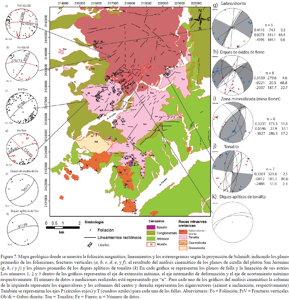 En el plutón San Jerónimo se midieron sistemáticamente fracturas primarias, tanto verticales, como horizontales. Las horizontales, que de acuerdo con Phillips (1974; citado en Price y Cosgrove, 1991) tienden a ser paralelas a los esfuerzos principales mínimos, no aportaron información relevante pues son escasas y al graficarlas en la red estereográfica no presentan un patrón definido. En cambio, de acuerdo con los autores citados, las numerosas fracturas verticales son paralelas a la dirección de movimiento del magma y al esfuerzo principal máximo, por lo que pudieron agruparse en las unidades gabrodiorítica y tonalítica (Figura 7). En este mapa se observa que los polos de las fracturas verticales en el cuerpo gabrodiorítico del norte definen planos promedio en dos direcciones casi ortogonales: uno 12° / 88° y otro, perpendicular, orientado 270° / 81° (Figura 7a). Dichos planos de fracturas son casi paralelos a las orientaciones de los lineamientos rectilíneos más importantes del intrusivo gabrodiorítico. Las fracturas de la tonalita muestran una tendencia según el plano promedio 47° / 88° (Figura 7c) que es casi igual a la de los diques de óxidos de fierro que cortan a este cuerpo y cuya dirección promedio es 50° / 71° (Figura 7e).