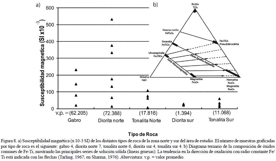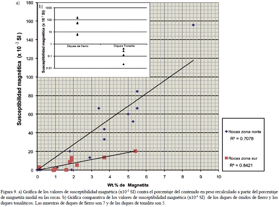 En vista de que los diques de fierro están encajonados por cuerpos de aspecto tabular de tonalita con textura aplítica, se midió la susceptibilidad magnética de cinco muestras de tonalita y siete de los diques de óxidos de fierro (Tabla 1 y Figura 9b). En la Figura 9b se observa una marcada diferencia entre los valores de susceptibilidad magnética de los diques de óxidos fierro y los tonalíticos. Debe notarse, sin embargo, que existen muestras de diques de óxidos de fierro que tienen susceptibilidades magnéticas muy bajas (< 60 x 103 SI).