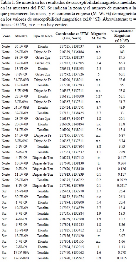 En esta sección se presentan la relación entre óxidos de fierro analizados en el microscopio electrónico y los valores de susceptibilidad magnética de los distintos tipos de roca, y se analiza la distribución de los valores magnéticos a través del plutón. Se mostrará también el mapa magnético del área de estudio, utilizando el levantamiento aereomagnético adquirido del Servicio Geológico Mexicano (SGM, 2003), a partir del cual se identificaron anomalías magnéticas y su correlación con los rasgos geológicos observados y, por último, se presenta el resultado de la interpretación cualitativa y cuantitativa de estas anomalías.