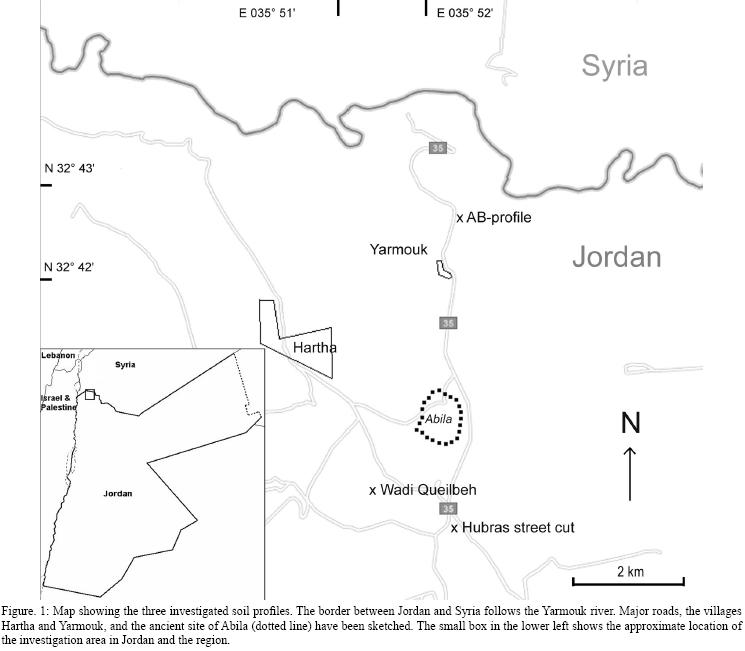 We studied three different Terra Rossa profiles near the ancient site of Abila in northern Jordan, close to the modern city of Irbid (Figure 1). The landscape of the area consists of a plateau of horizontally layered, banked limestones (Belqagroup according to Bender, 1974), which is nearly continuously covered by Terra Rossa, and dissected by several steep valleys (for more details see: Lucke, 2008). The area enjoys a Mediterranean climate with hot, dry summers and moist winters, and receives about 400 mm of precipitation (annual average). Despite the uniform appearance of the plateau's soil cover, the present Terrae Rossae show some variations and we selected our test sites accordingly: the first site appeared visually qualified for metasomatic processes since it exhibited a "bleached zone" similar to the one described by Merino and Banerjee (2008); the second seemed characterised by saprolite and thus qualified for a residual origin; and the third appeared to have formed out of allochthonous sediments.