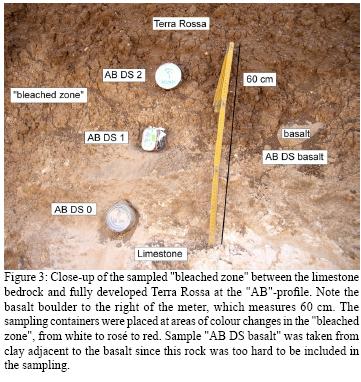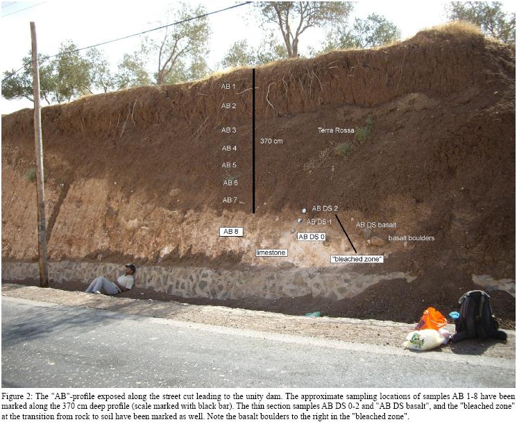 Our first test site (ABprofile, samples "AB DS" 0, 1, and, 2, location: N 32° 42' 54.0'', E 35° 52' 28.8'', Figure 2) was exposed by a newly constructed road leading to the Unity Dam in the Yarmouk valley between Jordan and Syria. Olives were planted at the top, and roots present throughout the profile, reaching into fissures of the limestone. At the bottom of the profile, a "bleached zone" was present at the rocksoil transition that appeared similar to the one described by Merino and Banerjee (2008), although being significantly larger. Schmidt et al. (2006) and Lucke (2008) interpreted the lower 250 cm of the profile as insitu Terra Rossa paleosol preserved in a karst pocket, while the upper 100 cm showed signs of strong fluvial redeposition. In the "bleached zone", strongly weathered basalt boulders "floating" at the rocksoil transition were observed, evidence of a once larger distribution of lava flows (Figures 2 and 3).