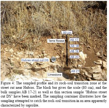 The second test site was exposed at a street leading to the village of Hubras (sample "Hubras street cut DS", location N 32° 40' 04.9", E 35° 50' 46.7", Figure 4), under an agricultural field planted with olives and wheat. Roots were present throughout the profile, reaching into the fissures of the limestone. This profile did not show a bleached zone: the rocksoil transition merely looked like saprolite as would be expected from the "residual" theory of Terra Rossa formation. In this profile, one thin section sample was collected from the soilrock transition, while calcium carbonate content and texture were determined with the methods described above of four bulk soil samples.
