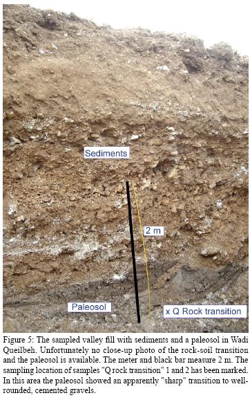 The third test site was a Terra Rossa paleosol in Wadi Queilbeh that formed on strongly cemented, hard and wellrounded wadi gravel (samples "Q rock transition" 1 and 2, location N 32° 40' 17.6", E 35° 51' 51.5", Figure 5). The paleosol had later been buried by huge layers of gravel, rubble, and other sediments in the valley's recent history. This profile showed neither a "bleached zone" nor "saprolitic" weathering of bedrock. Instead, it was characterized by an apparently sharp transition between soil and the cemented wadi gravel as would be expected according to the "aeolian" theory that considers Terra Rossa derived from allochthonous material. A few roots were present in the paleosol. Bulk samples from the upper part of the profile had previously been studied by Lucke (2008). Since the allochthonous origin of the largest part of the profile seemed clear, we investigated only the micromorphology of the paleosolrock contact zone.