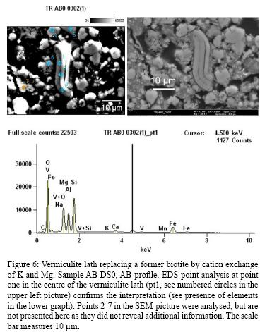 ii) Relatively large phyllosilicates (some tens of microns) that sparsely occur throughout the AB profile are of detrital origin, most probably derived from some former sandy or silty intercalations within the carbonate layers. Some of them still show a former biotite composition with higher iron and potassium contents, while others were completely altered and changed to clay minerals as the vermiculite lath shown in figure 6.