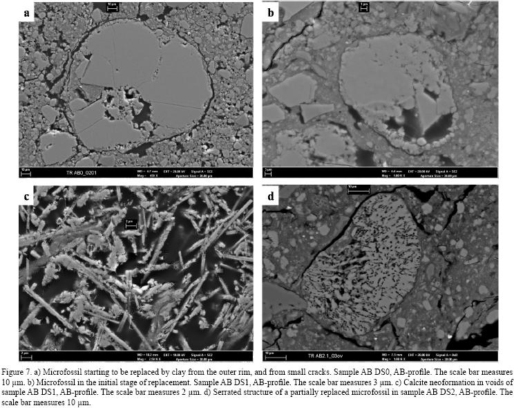 Optical investigation of our first test site at the ABprofile showed more or less unaltered biogenic calcareous rock in the lowest sample AB DS0 that was taken at the transition from white to greyish limestone. It contains many foraminifera skeletons as well as some shells together with small calcium carbonate plates that might have formed during recrystallization processes. Clay and iron are present in a reddishbrown matrix that occasionally contains allochthonous material such as probably primary detrital biotite altered to vermiculite; a postsedimentary input and transport through fissures in the rock seems unlikely (Figure 6). But most importantly, closeups of the microfossils under a SEM showed how the rims of these structures are being replaced by clay, though still in an initial stage (Figure 7a).
