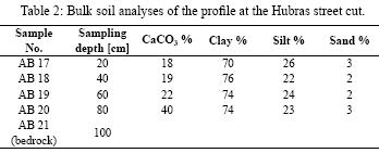 The limited bulk soil analyses of our second test site (at the street to Hubras) yielded results again confirming the field impression (Table 2). In contrast to the first test site, this profile shows an increasing content of calcium carbonate towards the bottom and a very clayrich texture as would be expected according to the residual theory.