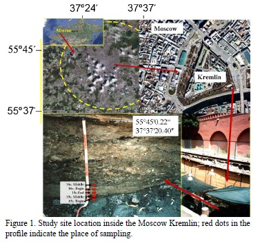 In 2007 protective excavations were undertaken in the Taynitsky Garden area of the Moscow Kremlin territory (Figure 1) under the guidance of the archaeologists V.Yu, Koval, T.D. Panova, and D.O. Osipov. In the course of digging, dung deposits of different age were exposed and described in unit A5, excavation II, and sampled for laboratory analysis. Altogether five samples were taken from archeologically dated dung layers (from the bottom upwards) as follows: beginning, middle and end of the 15th century (approximately 1470); and beginning and middle of the 16th century.