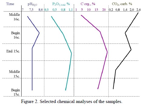Organic carbon is present in abundance, which is typical both of cultural layers and of organic deposits such as dung. The proportion of organic constituents decreases towards the middle of the 16th century; that may be attributed to a considerable admixture of practically undecomposed sawdust in the dung layer, as well as to presence of construction debris mixed with the dung.