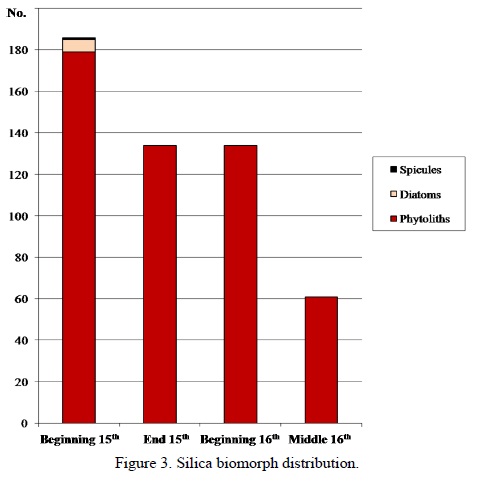 As is typical of dung layers, phytoliths are abundant in the samples. The only exception is the latest layer dated to the middle of the 16th century, where phytoliths are less than half as abundant as in other samples. That may be attributed to a considerable proportion of wood debris (sawdust and wood shavings) in the layer; the proportion of phytoliths being accordingly reduced.