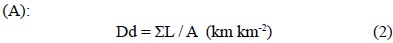 Se define como la longitud total (ΣL) de los cauces dentro de la cuenca, dividida entre el área total de drenaje (A):