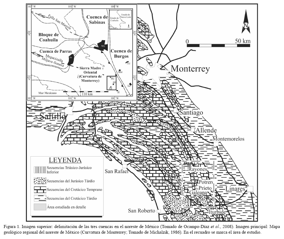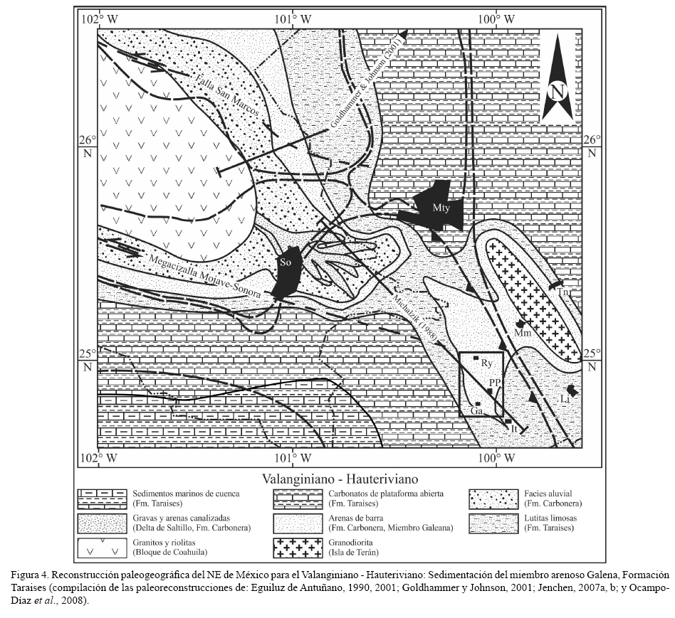 Durante el Jurásico Medio-Cretácico Temprano, debido a un régimen de subducción oblicua situado en la margen paleo-pacífica, se desarrolló fallamiento lateral izquierdo y sistemas transtensivos, generando cuencas intra-cratónicas, pull-apart y strike-slip denominadas: Sistema de Cuencas strike-slip McCoy-Sabinas (Tardy et al, 1989; Bassett y Busby, 2005; Mickus et al, 2009; Ocampo-Díaz, 2011). Entre tanto en la margen Atlántica, se iniciaba la apertura del Golfo de México (Michalzik, 1988; Fillon, 2007; Ocampo-Díaz, 2007), favoreciendo que se depositaran en las inmediaciones de los altos de basamentos secuencias carbonatadas y siliciclásticas en ambientes continentales y costeros (formaciones La Gloria y Minas Viejas; Buffler y Sawyer, 1985; Michalzik, 1986 y 1988; Salvador, 1991). Estos depósitos cambian verticalmente a facies lodosas de rampa externa y playa de la Formación Zuloaga (Michalzik, 1988, Goldhammer, 1999). La Formación Olvido sobreyace de manera concordante a la Formación Zuloaga y se caracteriza por depósitos evaporíticos, calcáreos y capas rojas (Michalzik, 1988; Gótte, 1988). El Jurásico Tardío se conforma por depósitos marinos marginales (deltas y línea de costa) que cambian lateralmente a depósitos de plataforma abierta de la Formación La Casita (Michalzik, 1988; Michalzik y Shumman, 1994; Figuras 1 y 2). En el Cretácico Temprano se depositaron secuencias carbonatadas en ambientes de plataforma abierta, dentro de un régimen de subsidencia uniforme de la Formación Taraises (Michalzik, 1986, 1988), y también rocas clásticas dentro de sistemas costeros del miembro arenoso Galeana (Díaz-González, 1953; Michalzik, 1988; Ocampo-Díaz, 2007; Ocampo-Díaz et al, 2008).