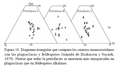 Las plagioclasas predominan en todas las petrofacies, con relaciones que van de 0.5-2.8 (P/K), evidenciando rocas fuentes plutónicas de composiciones variables. Las muestras con relaciones de P/K > 1 registran fuentes de composiciones plutónicas variables (e.g., granitoides), mientras que muestras con valores de P/K < 1 indican procedencias de rocas de composición granodiorítica como lo han documentado Marsaglia (1991) y Critelli y Nilsen (2000) (Tabla 3; Figura 10).