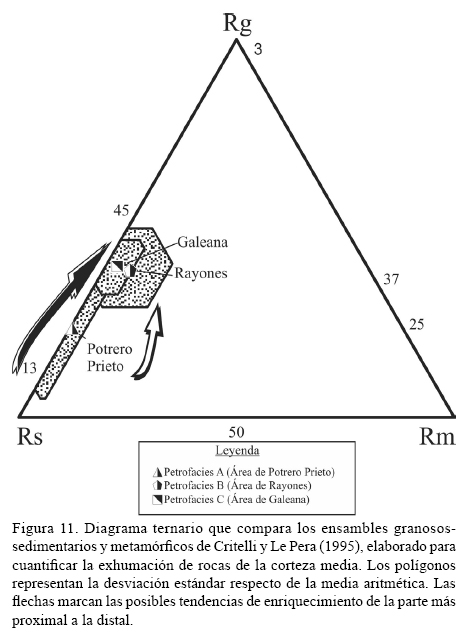 El diagrama ternario Rg-Rs-Rm de Critelli et al. (2002) sugiere que la petrofacies A tiene mayor influencia de ensambles sedimentarios (e.g. lutitas, areniscas-Rs), mientras que las petrofacies B y C muestran una composición mixta del ensamble granoso con el ensamble sedimentario con poca adición de los ensambles metamórficos (e.g. granitos, gneises-Rg; Figura 11).