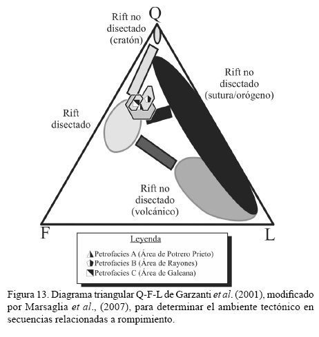Garzanti et al. (2001) y Marsaglia et al. (2007) proponen un diagrama QFL actualista en ambientes de tipo rift. Dentro de este diagrama las muestras de las petrofacies A y C se ubican dentro del campo de rift disectado (Figura 13), mientras que las muestras de la petrofacies B se grafican en el límite del campo de rift disectado con tendencias al rift no disectado con influencia de orógeno o sutura.