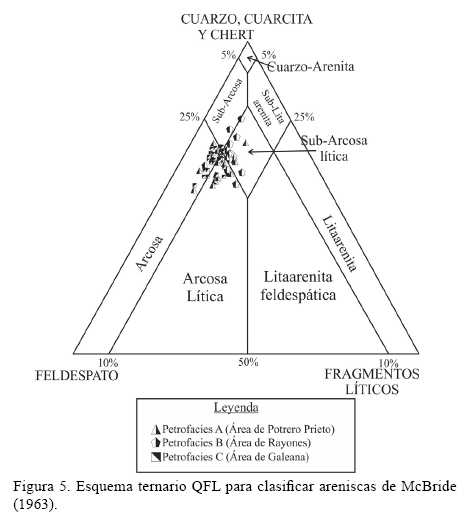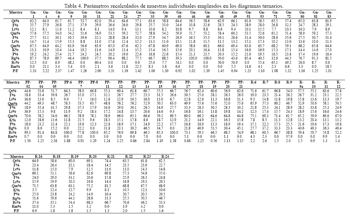 El análisis petrográfico se realizó sobre 140 muestras de areniscas de grano medio a fino, de las áreas de Potrero Prieto, Rayones y Galena (Figura 4). El análisis modal se efectuó en 58 muestras seleccionadas de areniscas de grano medio (Figura 3). Las láminas delgadas fueron atacadas químicamente con HF y teñidas con una solución hiperconcentrada de cobaltonitrito de sodio y cloruro de bario, para diferenciación rápida de los feldespatos potásicos y plagioclasas, de acuerdo con la metodología de Marsaglia y Tazaki (1992). El análisis petrográfico cuantitativo se elaboró por medio de un conteo de 400 a 500 granos libres de matriz por lámina delgada, utilizando el método de Gazzi-Dickinson (Ingersoll et al., 1984). Los tipos de cuarzos fueron clasificados de acuerdo a Basu (1976), Basu et al. (1975), Blatt y Christie (1963) y Young (1976). Los líticos volcánicos se diferenciaron bajo los criterios de Dickinson (1970) y Marsaglia et al. (1992), mientras que los granos metamórficos fueron clasificados de acuerdo a Garzanti y Vezzoli (2003), quienes emplean subíndices para indicar el grado metamórfico de la roca madre. Los parámetros petrográficos empleados en los diagramas ternarios son mostrados en la Tabla 1 y se obtuvieron de acuerdo a los criterios de McBride (1963; QFL), Dickinson (1985), Dickinson y Suczek (1979; QmFLt; QmPK). Además de las metodologías de Arribas et al. (1990), Critelli e Ingersoll (1994) y Arribas et al. (2003), se tomaron los parámetros que conforman los ensambles granosos (Rg), sedimentarios (Rs) y metámorficos (Rm). La base de datos del conteo de puntos de las 58 muestras es mostrada en la Tabla 2 y los parámetros estandarizados y sus medias aritméticas y desviaciones estándar son mostrados en las Tablas 3 y 4.