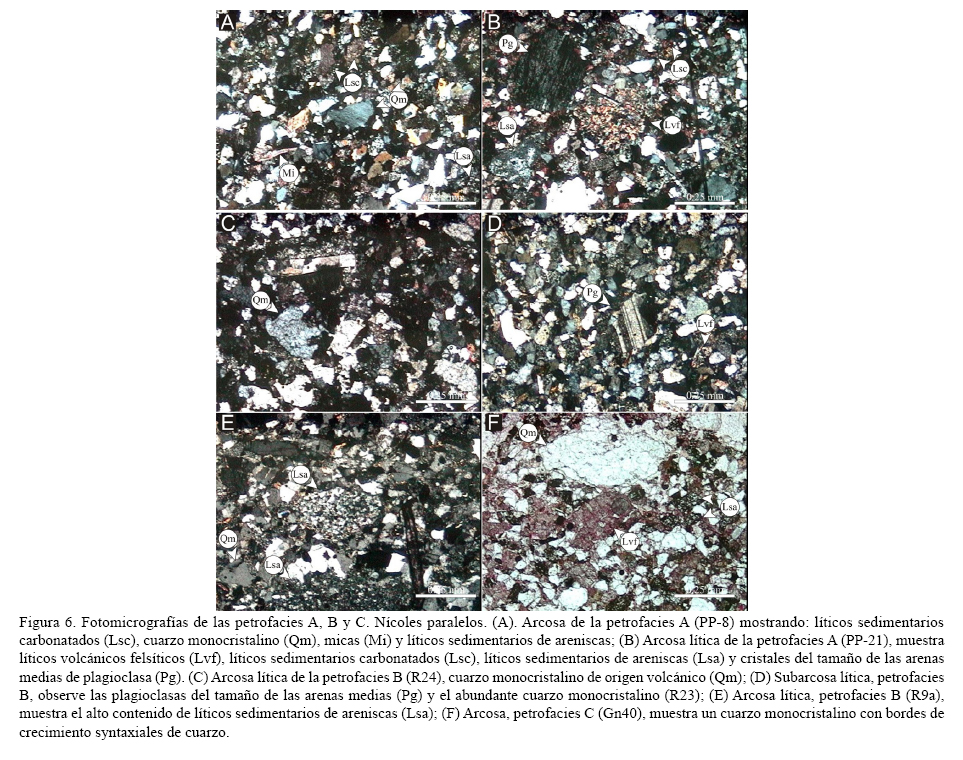 Las areniscas de esta petrofacies son arcosas líticas que van de moderadas a bien clasificadas (Figura 5; Q59F28L13; McBride, 1963). La población más abundante está constituida por cuarzos monocristalinos subredondeados a redondeados (Figura 6A), con extinción no-ondulante > ondulante. El cuarzo policristalino con más de tres cristales (Qm > 3) es poco frecuente, mostrando textura tectónica caracterizada por contactos suturados y extinción individual grano a grano. Los granos de feldespatos son subangulosos a subredondeados, siendo más abundantes las plagioclasas con maclado polisintético que los feldespatos potásicos con maclado de tipo carlsbad (P/F ~ 1.35; Tablas 3 y 4). Los fragmentos líticos son subangulosos a subredondenados, siendo en orden de abundancia: fragmentos de areniscas de grano fino, fragmentos de lutitas, líticos carbonatados con texturas micríticas y esparíticas, abundante chert, líticos volcánicos con textura felsítica, (Figura 6A y 6B), líticos metamórficos metapsamíticos/felsíticos2 y escasos líticos metapsamíticos/felsíticos3 y escasos fragmentos líticos plutónicos con texturas faneríticas de granodioritas o granitos. Los minerales accesorios incluyen circón, turmalina, moscovita y minerales opacos no identificados, además de fragmentos fósiles.