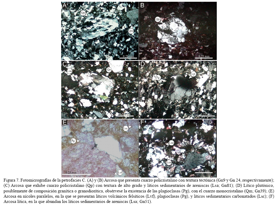 Los tipos de cuarzos registran como áreas fuente: (1) cuarzo con extinción no-ondulante y estrías, el cual en las muestras analizadas está posiblemente relacionado con áreas fuente plutónicas; (2) cuarzo metamórfico (policristalino con fábrica tectónica), que sugiere una fuente de rocas metamórficas de grado bajo a medio (Figura 7A); (3) cuarzo volcánico con golfos de corrosión, registra procedencias de rocas volcánicas de composición intermedia; (4) cuarzo policristalino con biotita asociada, sugiere procedencias de rocas metamórficas de alto grado (Figura 7C); (5) y cuarzos con bordes de crecimiento sintaxial que pueden representar cuarzos de segundo ciclo de sedimentación relacionados con los procesos de reciclamiento, como ha sido documentado por Blatt (1967) y Mokowitz y Sibley (2001).