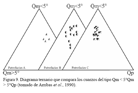En el diagrama ternario que compara los parámetros Qmr-Qmo-Qp propuesto por Arribas et al. (1990; Figura 9 y Tablas 2 y 3), las muestras de las tres petrofacies se ubican sobre el vértice en la parte central del triángulo. Sin embargo, las muestras de la petrofacies A presentan un mayor enriquecimiento de cuarzo policristalino.