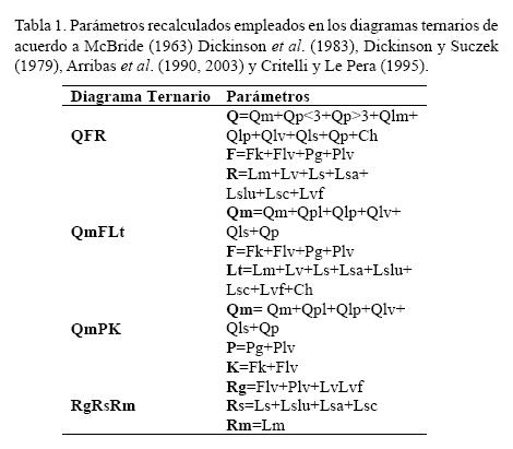 La composición del o las áreas fuentes se evaluó empleado metodologías de diversos autores (e.g. Basu et al., 1975; Arribas et al., 1990; Marsaglia, 1991; Johnson, 1993), quienes documentan la composición de áreas fuentes de acuerdo a criterios como: (i) variaciones en los tipos de cuarzos; (ii) concentración relativa de diferentes fragmentos líticos; y (iii) las relaciones que presentan las plagioclasas versus el feldespato-K.