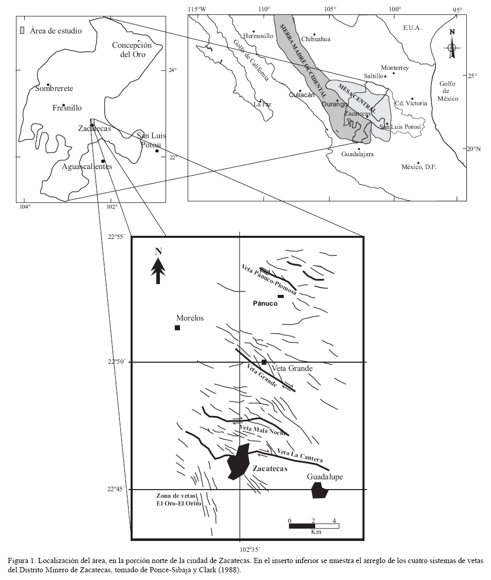 El norte de la sierra de Zacatecas (SZ) forma parte de la región límite entre las provincias fisiográficas de la Sierra Madre Occidental (SMO) y la Mesa Central (MC). En su porción norte se ubica el distrito minero de Zacatecas, considerado en el siglo pasado como uno de los centros mineros más importantes en la producción de plata y oro, así como de plomo, zinc y cobre. Los yacimientos se alojan en vetas hidrotermales, sobresaliendo las vetas La Cantera, Mala Noche, Veta Grande y Pánuco-Casa de Cerros (Figura 1). Su bonanza minera se inició en el tiempo de la Colonia y concluyó a fines del siglo XIX. La geología de estos yacimientos se ha descrito por varios autores entre los que sobresalen Stone (1956); Bastin (1941); Mapes (1949); Pérez-Martínez et al. (1961); Ranson (1975); Ocejo-Pérez (1979) y Ponce-Sibaja (1985). Un trabajo de síntesis fue publicado recientemente por el Servicio Geológico Mexicano (1999) (Caballero-Martínez et al., 1999). Actualmente la actividad minera está renaciendo y recientes trabajos de exploración directa han derivado en la ubicación de nuevos cuerpos mineralizados alojados en vetas, sobresaliendo la de Mala Noche explotada por la Compañía Minera Capstone Gold S. A. de C. V., cuyo concentrado principal es de cobre.