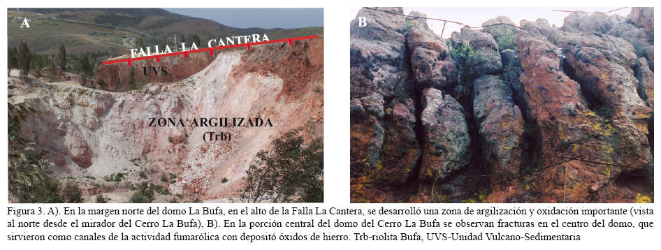 La lava que formó el domo La Bufa se emplazó donde la falla La Cantera muestra una inflexión hacia el SW, ocasionando el desarrollo de una zona de dilatación que facilitó la salida de la lava (Figuras 2 y 9). El domo La Bufa es una estructura elíptica, con eje mayor con rumbo E-W, paralelo al rumbo de la traza de la falla (Figuras 2 y 9). La falla La Cantera cortó al domo en su margen norte, donde formó una zona importante de argilización y silicificación (Figura 3A). Este domo tiene zonas muy silicificadas y fracturas verticales con óxidos de hierro que representan una actividad fumarólica importante (Figura 3B).