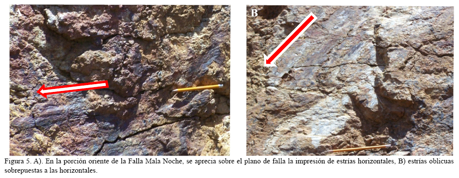 El sistema de vetas que forman la zona mineralizada de Mala Noche se localiza al norte de la veta La Cantera; tiene una longitud aproximada de unos 5 km. Su segmento poniente tiene un rumbo N75°W, y en su porción oriente ENE, la inclinación de su plano de falla varía entre 60° y 80° NNE. El cambio de rumbo de esta falla está marcado por una zona de dilatación de forma sigmoidal en la cual se desarrollaron múltiples vetas (Figuras 2 y 4). A lo largo de la veta Mala Noche se presenta un patrón múltiple de estructuras Riedel que indican un movimiento lateral derecho (Figura 4). En su extremo oriental, a la altura del tiro Bolado, la veta se ramifica formando un arreglo de "cola de caballo" con fallas normales de alto ángulo. En este segmento la falla Mala Noche tiene un rumbo N70°E con inclinación de 70°NW y en su plano se observan estrías horizontales, surcos de acumulación de sílice, estructuras de media luna que señalan un movimiento lateral derecho (Figura 5A). Sobrepuestas a las estrías laterales, se aprecian estrías oblicuas que reflejan una reactivación por movimiento normal oblicuo-derecho, las cuales tienen un pitch de 70° SE (Figura 5B). Los domos y diques La Sierpe y San Gil de rumbo NNE se encuentran emplazados en las fracturas R' (Figura 2). El arreglo del juego de fracturas Riedel desarrolladas en la zona de cizalla de la falla, muestran que Oj tuvo una dirección NW-SE (Figura 4). Los domos y diques presentan silicificación intensa que se asocia a la última etapa de mineralización en el área, la cual se puede presentar en las márgenes de los diques y en las porciones centrales a profundidad, información proporcionada por la barrenación. El sistema de vetas de Mala Noche son rellenos de fisura de cuarzo amorfo con asociación de sulfuros, sobre todo de calcopirita, por lo que su producción principal es de cobre. La secuencia de rocas sedimentarias que encajona a estas vetas consiste principalmente de lutita, arenisca, andesita y algunos diques máficos pertenecientes a la UVS. La UVS se encuentra muy deformada, con desarrollo de zonas de cizalla producto de los múltiples despegues tectónicos intraformacionales y en cuyos planos de bajo ángulo se aloja mineralización.