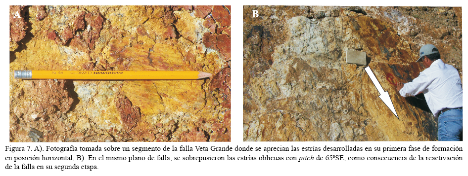 El sistema secundario de vetas R, tiene un rumbo promedio de N35°W con inclinaciones entre 60° y 75° SW, formando un ángulo promedio con VG de 20°. Las fracturas R y R' fueron medidas en campo y están representadas en el estereograma inserto de la Figura 6, con planos de rumbo entre N20°-30°E, en los que se observan estrías horizontales que reflejan un movimiento lateral derecho en su primera etapa de actividad (Figura 7A), y sobre de ellas están sobrepuestas estrías oblicuas las cuales tienen un pitch promedio de 65°-70° SE, lo que define a la falla como normal oblicua-derecha (Figura 7B). Las vetas están encajonadas en la UVS.